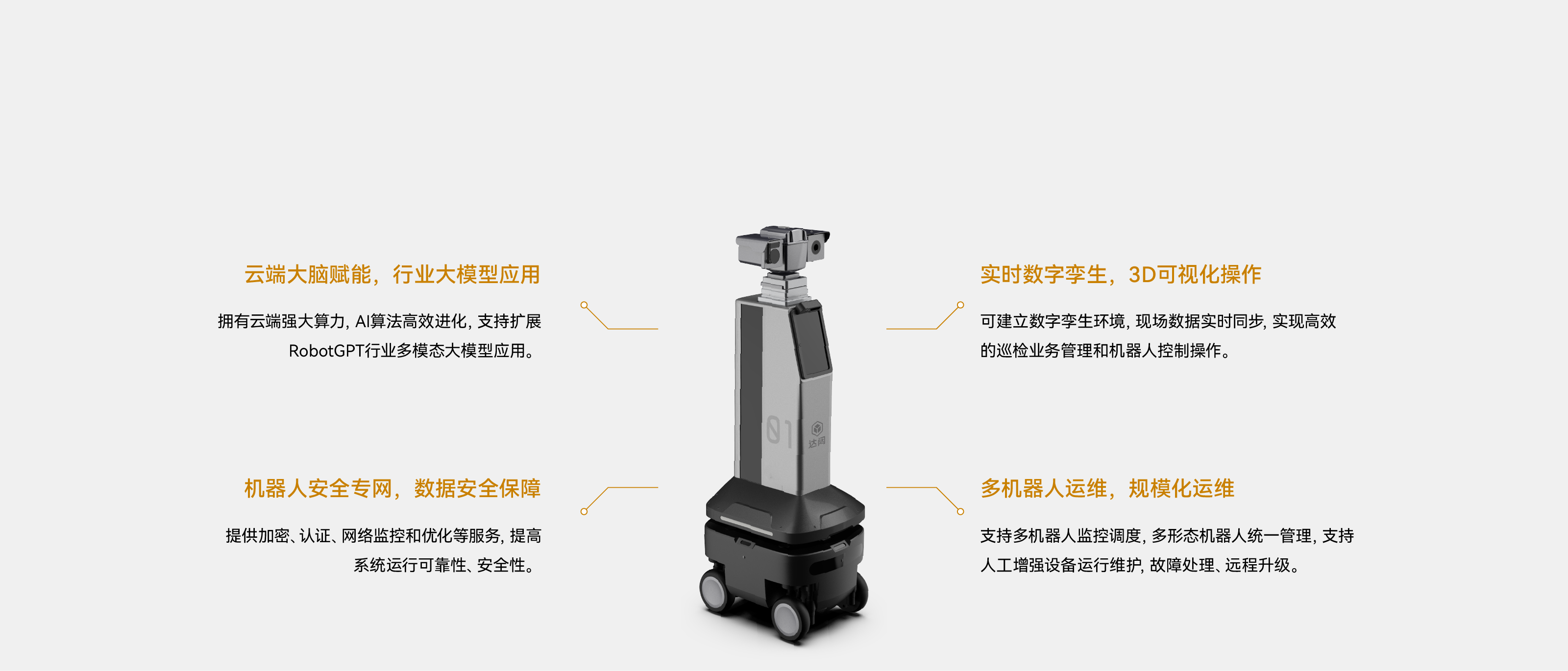 四舵轮底盘可360°全向移动,越障、爬坡、过沟能力超强;机身设计小巧,适合狭窄、复杂环境